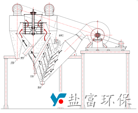 鹽富環(huán)保公司生產(chǎn)的YF-SF復(fù)合選粉機(jī)是將靜態(tài)的V型選粉機(jī)和內(nèi)循環(huán)高效渦流選粉機(jī)有機(jī)結(jié)合,可分級(jí)粒徑為4.75mm甚至 粒徑達(dá)10mm以上的物料。來(lái)料首先通過(guò)靜態(tài)的V選進(jìn)行粗細(xì)分離,中砂和細(xì)砂隨上升的氣流進(jìn)入高效渦流選粉機(jī)進(jìn)行分級(jí),石粉則被旋風(fēng)筒收集。從老式的轉(zhuǎn)子選粉機(jī)只能對(duì)機(jī)制砂簡(jiǎn)單脫粉到實(shí)現(xiàn)粗、中、細(xì)砂的 分級(jí)。