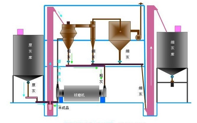 系統(tǒng)直接由原灰倉(cāng)下取灰,經(jīng)螺旋給料機(jī)給料,電子稱稱重后由空氣斜槽輸送進(jìn)入磨頭提升機(jī),由提升機(jī)喂入選粉機(jī)進(jìn)行磨細(xì)前的分選,分選后的粗灰經(jīng)空氣斜槽送入磨機(jī)進(jìn)料口,進(jìn)入球磨機(jī)研磨,經(jīng)磨機(jī)研磨后的物料中含有大量細(xì)灰,再次由提升機(jī)喂入選粉機(jī)分選,分選出的細(xì)灰經(jīng)后續(xù)輸送設(shè)備送入成品灰?guī),磨機(jī)尾部配有收塵系統(tǒng)進(jìn)行收塵,采用此種閉路研磨工藝與開(kāi)路(無(wú)選粉機(jī))系統(tǒng)相比可提高臺(tái)時(shí)產(chǎn)量30~40%以上,是粉煤灰磨細(xì)深加工的理想設(shè)備。